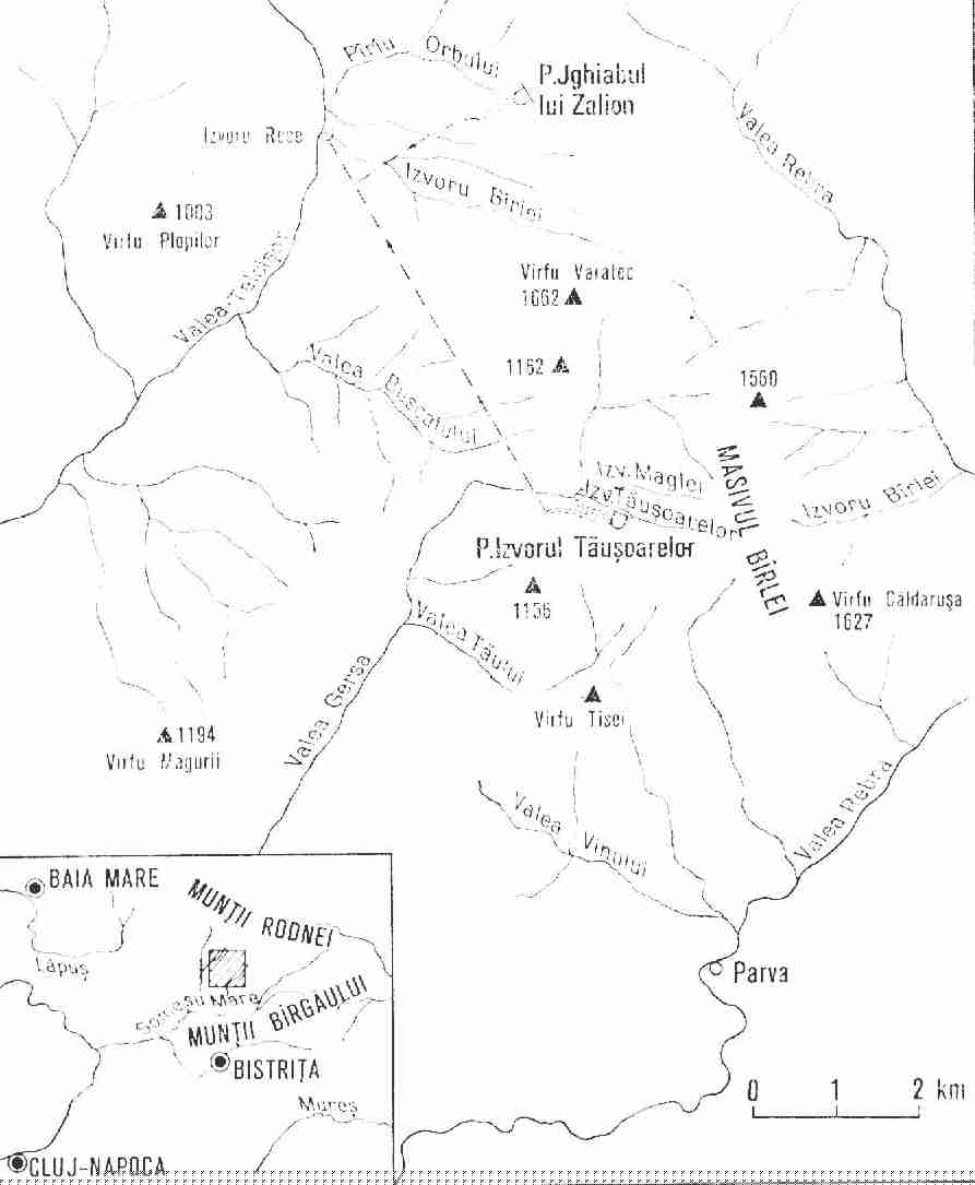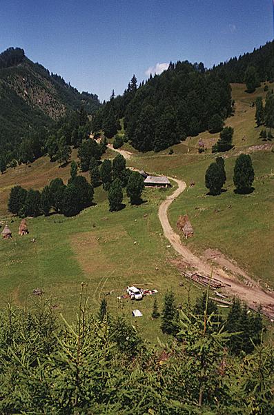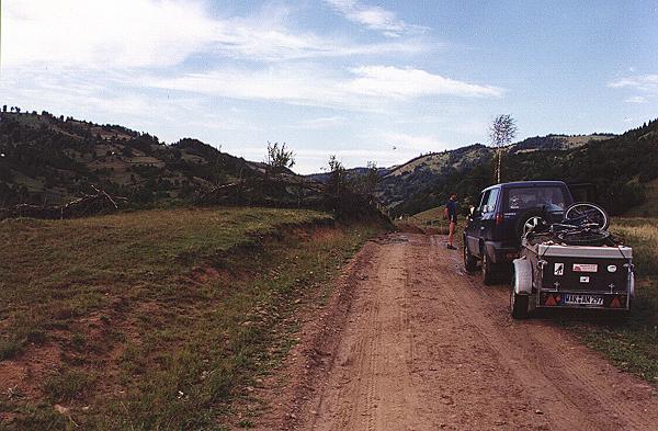 Am nächsten Morgen (03.08.2000) tätigten wir Einkäufe und versuchten einen Geldumtausch in der Stadt Huedin. Leider gab es keine Bank. Und eine freie Wechselstube war nicht imstande uns zu helfen. Uns wurde mitgeteilt, dass sie kein Geld haben ! Nachdem wir den Tank mit Diesel befüllen haben machten wir uns auf den Weg ins Bihor-Gebirge. Die Berge sind ja in der Ferne schon zu sehen. Dafür verlassen wir Huedin in südliche Richtung. Erst 10km weiter schalte ich das GPS-Gerät ein, um die östliche Bergpiste ins Bihor zu verfolgen. Wieder schleppen wir uns auf unbefestigten Wegen bergauf und bergab. Mitten im Gebirge legen wir in einer Streusiedlung an einem Magazin eine Pause ein und tranken Bier. Kurz zuvor durchfahren wir noch ein ziemlich großes Zigeuner-Camp. Die Unterkünfte der kleinen Familien sind so groß wie ein Iglu-Zelt. Allerdings bestehen diese fast ausschließlich aus Reisigwedeln und Kiefernadel-Gestrüpp. Ein armseliger Anblick und doch winken uns die Frauen und Kinder zu. Im Magazin, nur 800m weiter spielt unserer kleiner Sohn dann mit einigen Zigeunerkindern und die bunt bekleideten Mütter schauen belustigt auf den kleinen blonden Engel. Das ist schon ein Kontrast ! Nach insgesamt 3 Stunden treffen wir an der Schutzhütte "Cabana Padis" ein. Das GPS zeigt dort oben die Höhe von ca. 1000m an. Die Region um Padis ist auch für die Rumänen ein beliebtes Reiseziel und es waren in diesem Jahr wirklich viele Jugendgruppen hier. Für meinen Geschmack etwas zu viele ! Aber was soll's. Padis ist ein Muß, wenn man zu den Höhlen will und die Natur erleben ! Die Versorgung mit Lebensmitteln ist übrigens gegeben. Nicht nur in der Cabana gibt's etwas zum Essen. Auch in einer zweiten kleine Hütte kann man das Nötigste kaufen. Nur die traditionelle Versorgung mit Schafskäse an einer ganz bestimmten Almhütte klappt in diesem Jahr nicht so recht. Aber Schafskäsekuchen und eine Tasse Milch für den Kleinen von der sogenannten "Käse-Oma".